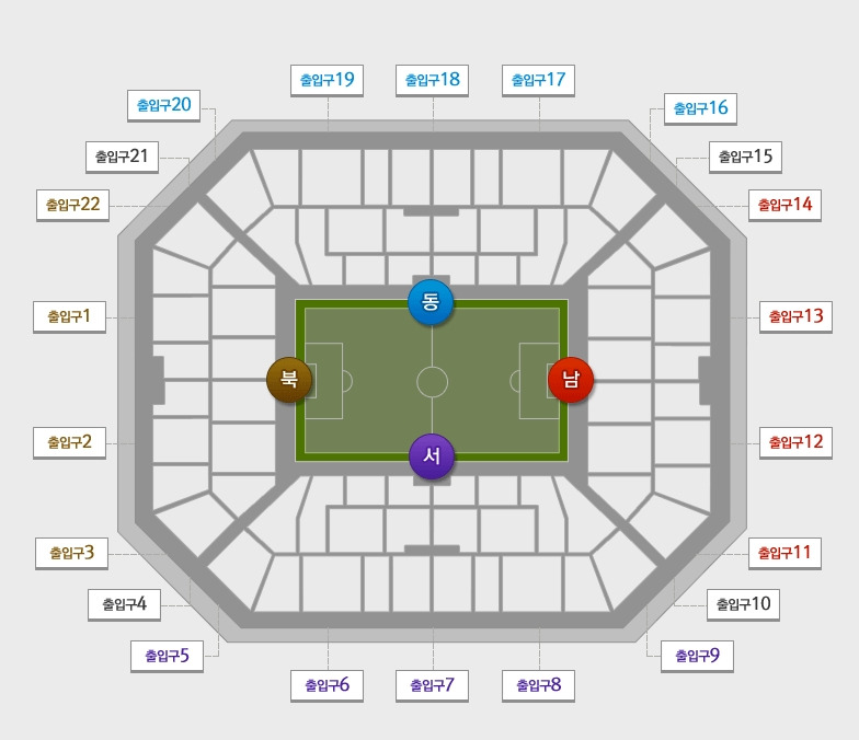 경기장 내 좌석 배치도는 다음과 같습니다. 각 섹션은 북, 남, 동, 서 방향으로 나뉘어 있으며, 각 섹션에는 출입구가 표시되어 있습니다. 팬 여러분은 미리 좌석 배치를 확인하고 예매 시 참고하시기 바랍니다.