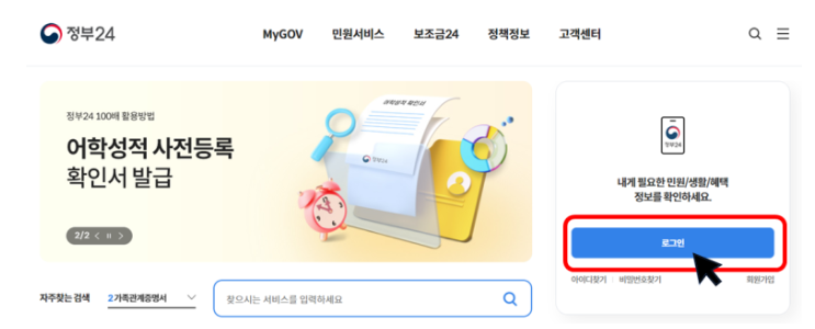 정부24 메인 등에서 로그인 버튼을 클릭하신 후