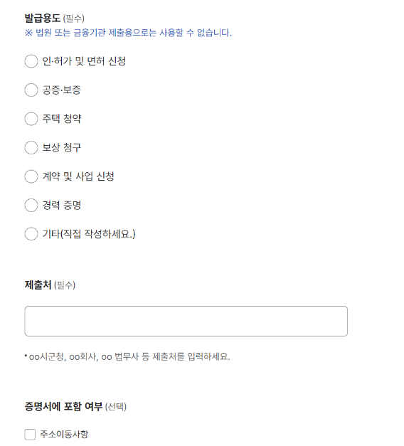 ④ 발급 용도, 제출처 등 추가 내용을 입력합니다.