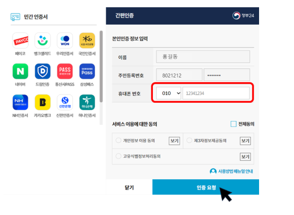 간편(민간) 인증으로 로그인하지 않은 경우, 휴대폰 번호 인증을 통해 휴대폰 번호를 입력하게 됩니다.