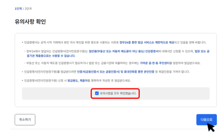 ② 유의사항 확인이 완료되었다면 체크를 하신 후, 다음으로 버튼을 클릭합니다.