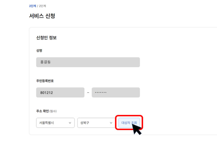 ② 주민등록 상 거주지 주소를 선택하신 후 대상자 조회를 클릭합니다.