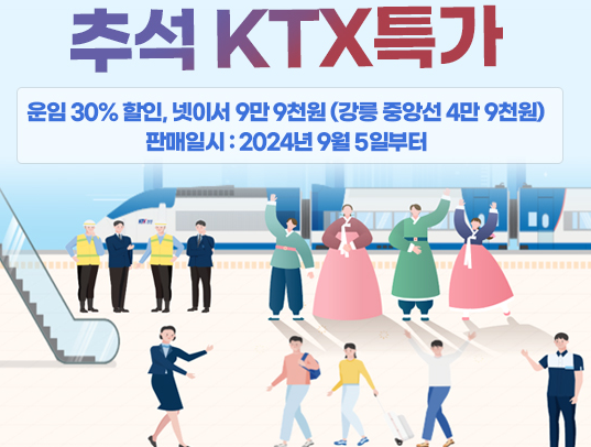 코레일에서 9월 5일(목)~ 9월 11일까지 KTX이용하는 고객님들께 추석 동안 빈좌석을 30%나 할인하고 있습니다.