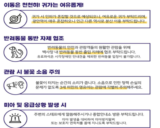 축제 기간 동안 안전은 가장 중요한 요소예요. 특히, 아이들이나 반려동물과 함께 오는 경우에는 더욱 주의해야 해요. 불꽃놀이 소음이 크기 때문에, 반려동물이 놀라지 않도록 주의하고, 아이들은 항상 가까이 두는 것이 좋아요. 만약의 경우를 대비해 응급 상황 시 도움을 요청할 수 있는 위치를 미리 파악해 두는 것도 중요해요.